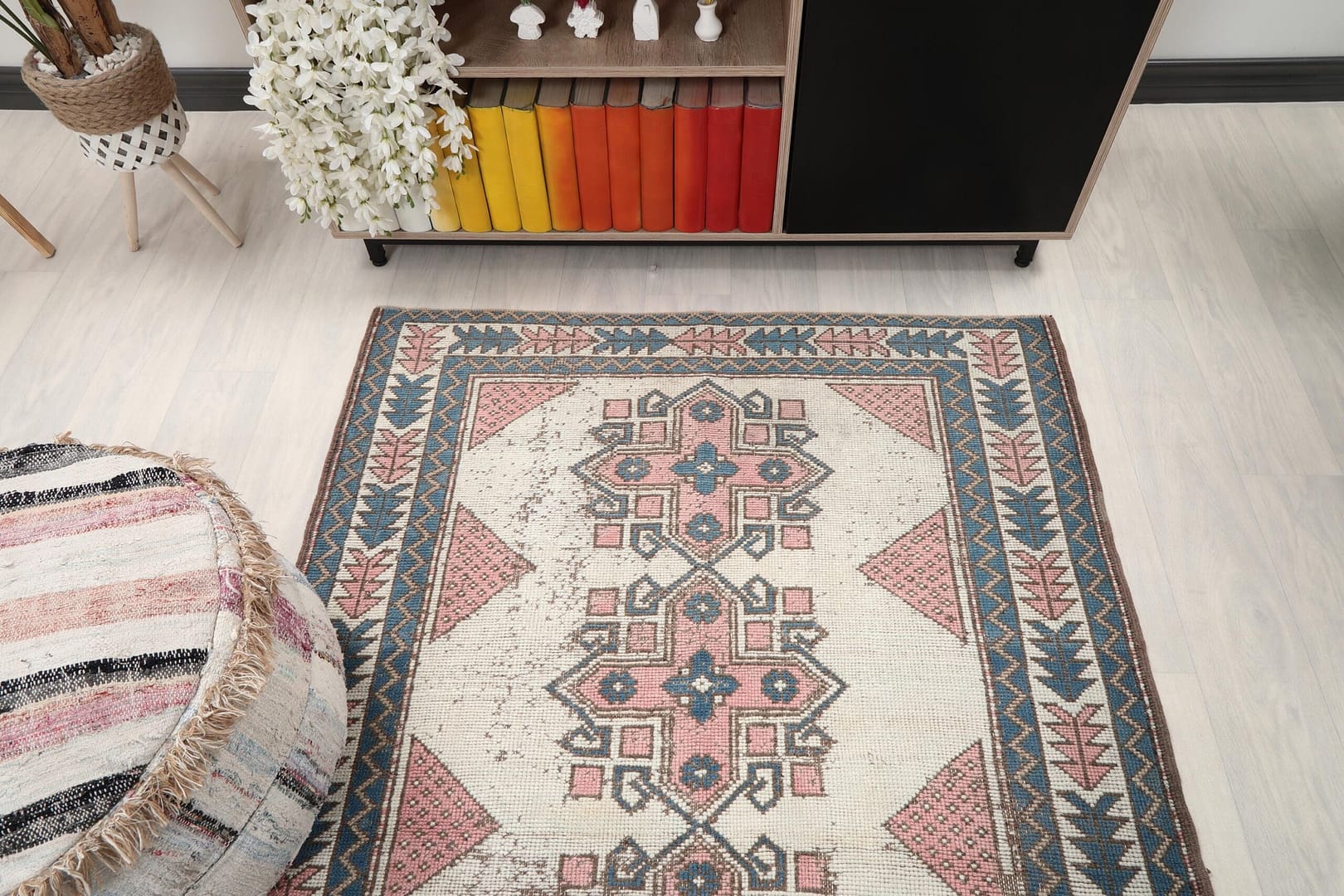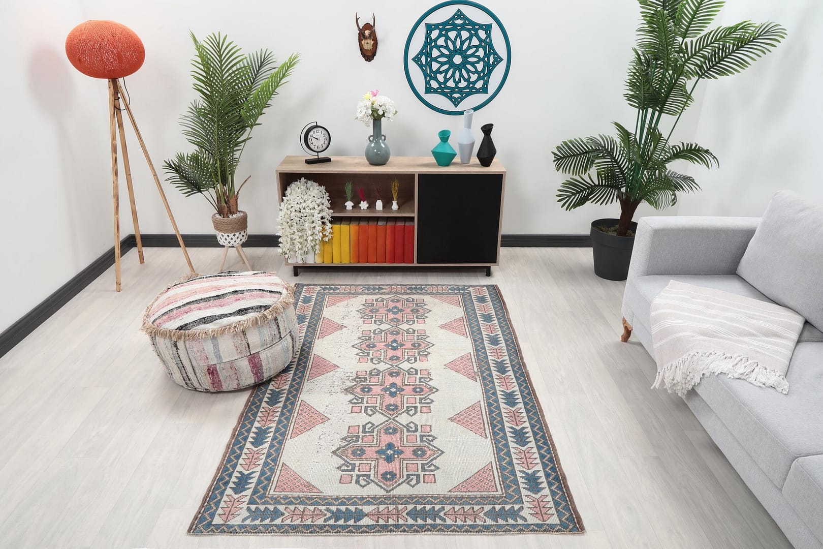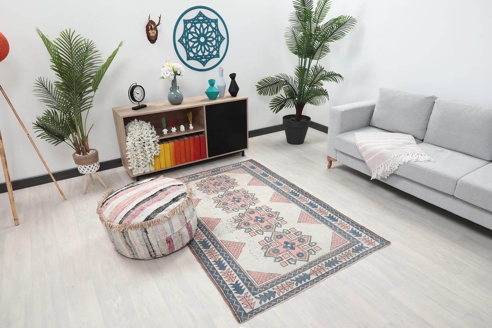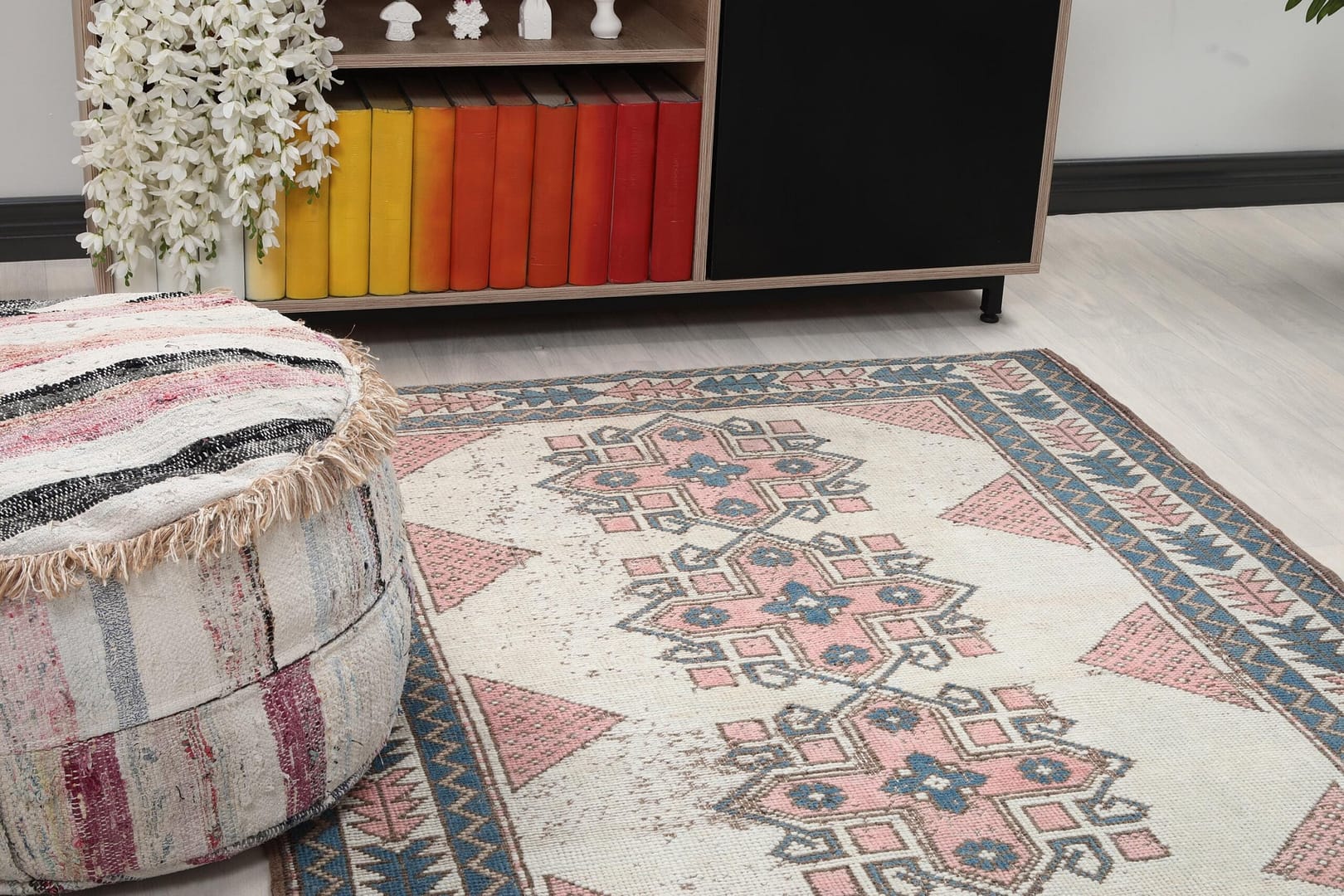 4×6 White Pink Blue Turkish Rug, 4×6 Handwoven Wool Rug, 4×6 Oushak Rug, Handmade Rug, Living Room Rug, Vintage Rug, Kitchen Rug, Dining Rug