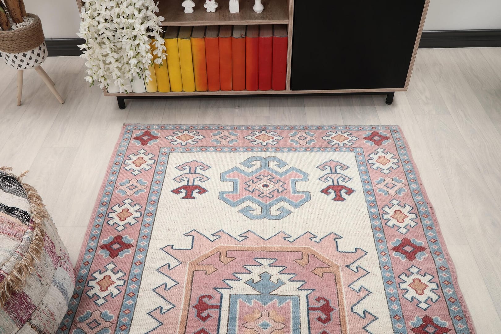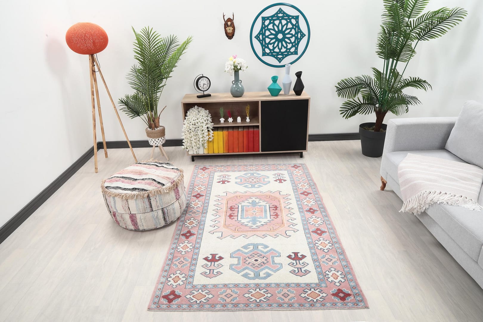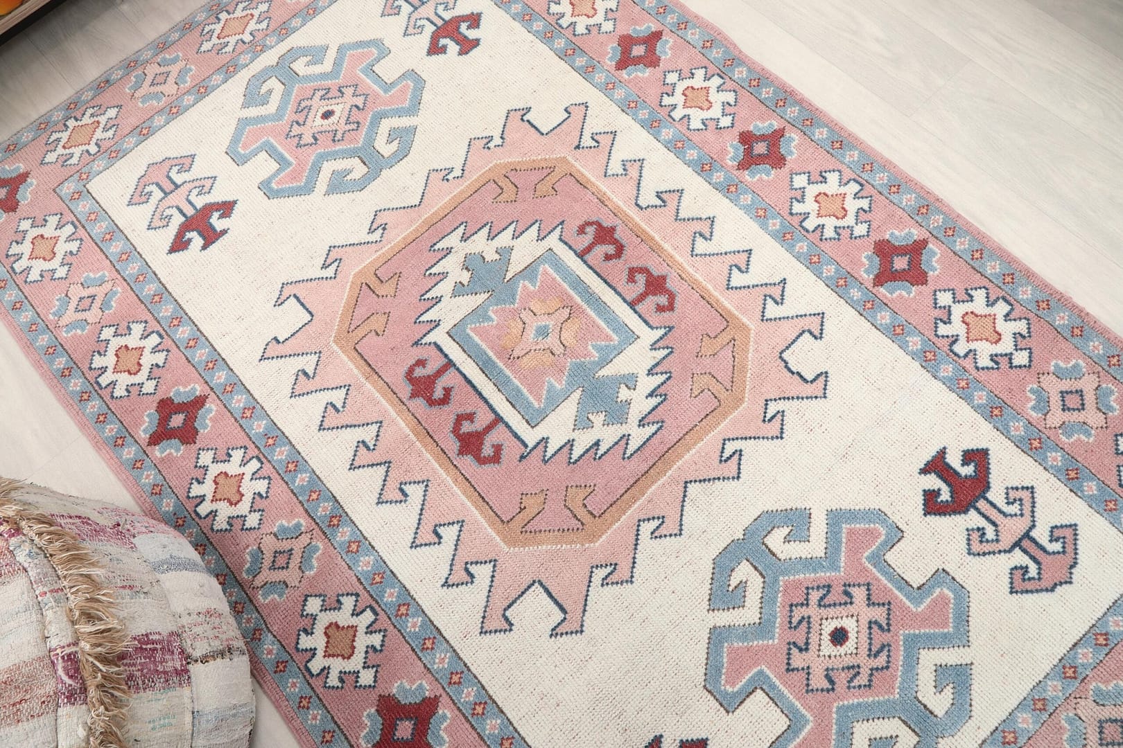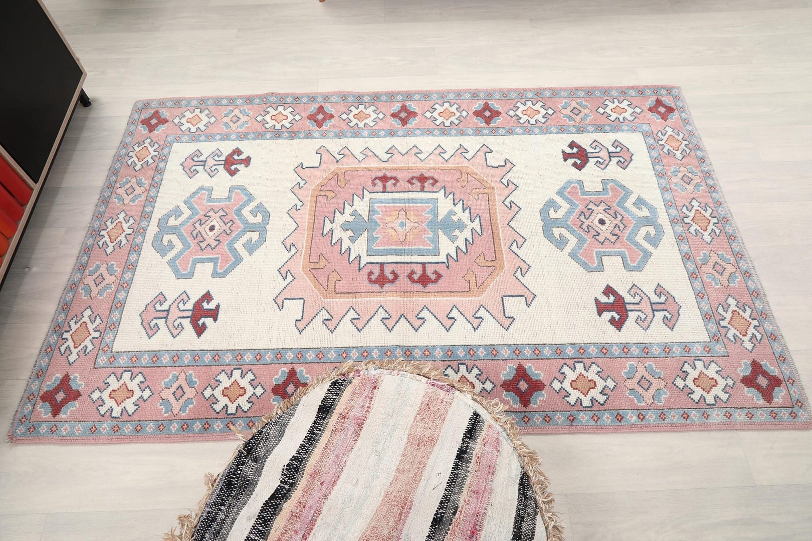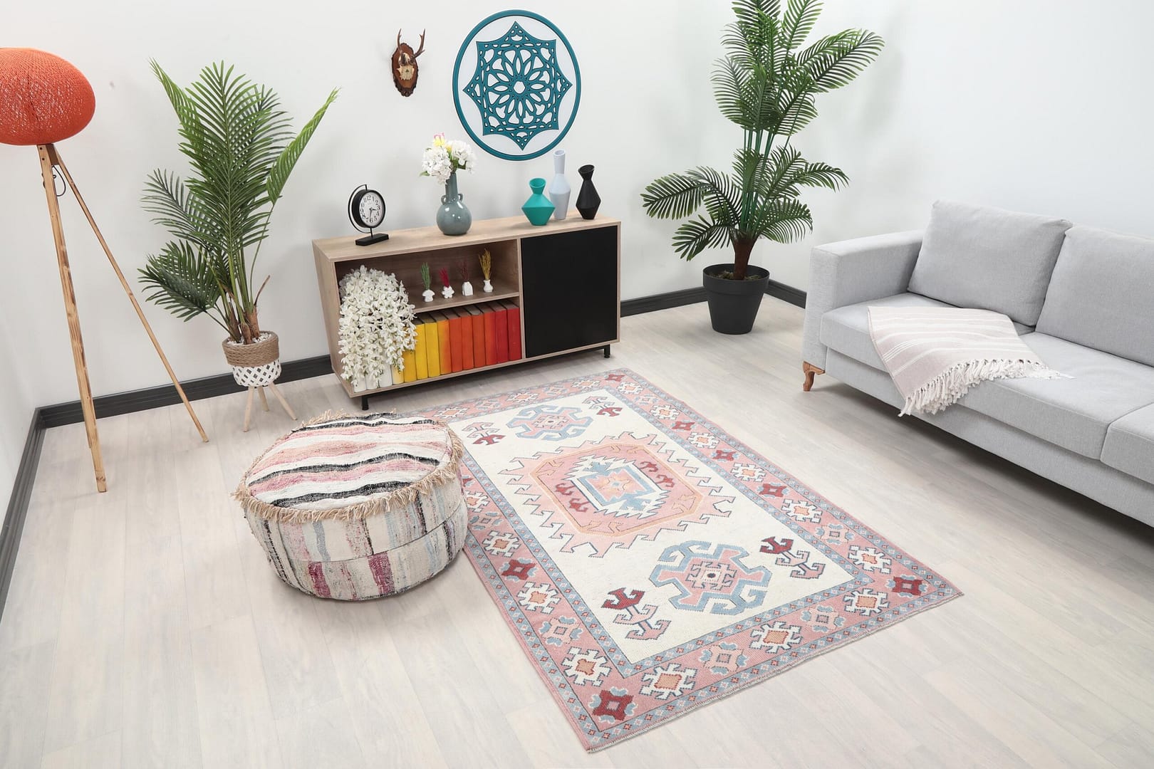 4×6 White Pink Turkish Rug, 4×6 Handwoven Wool Rug, 4×6 Oushak Rug, Handmade Rug, Living Room Rug, Vintage Rug, Kitchen Rug, Dining Rug