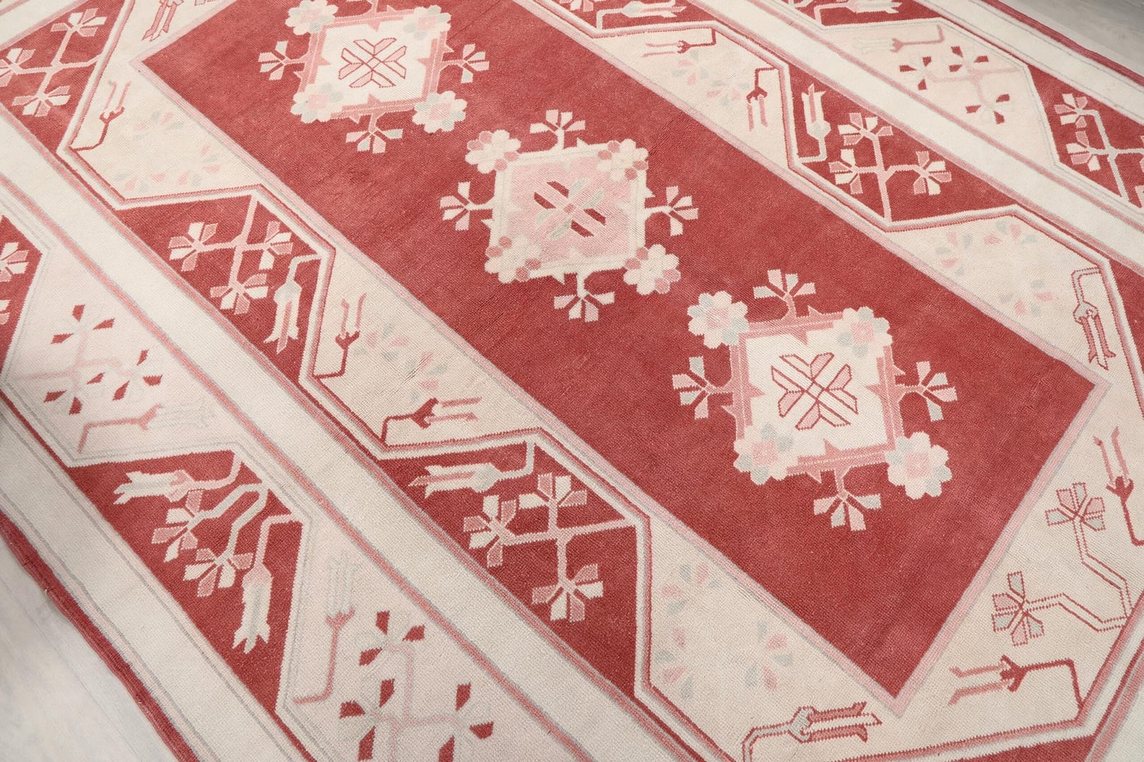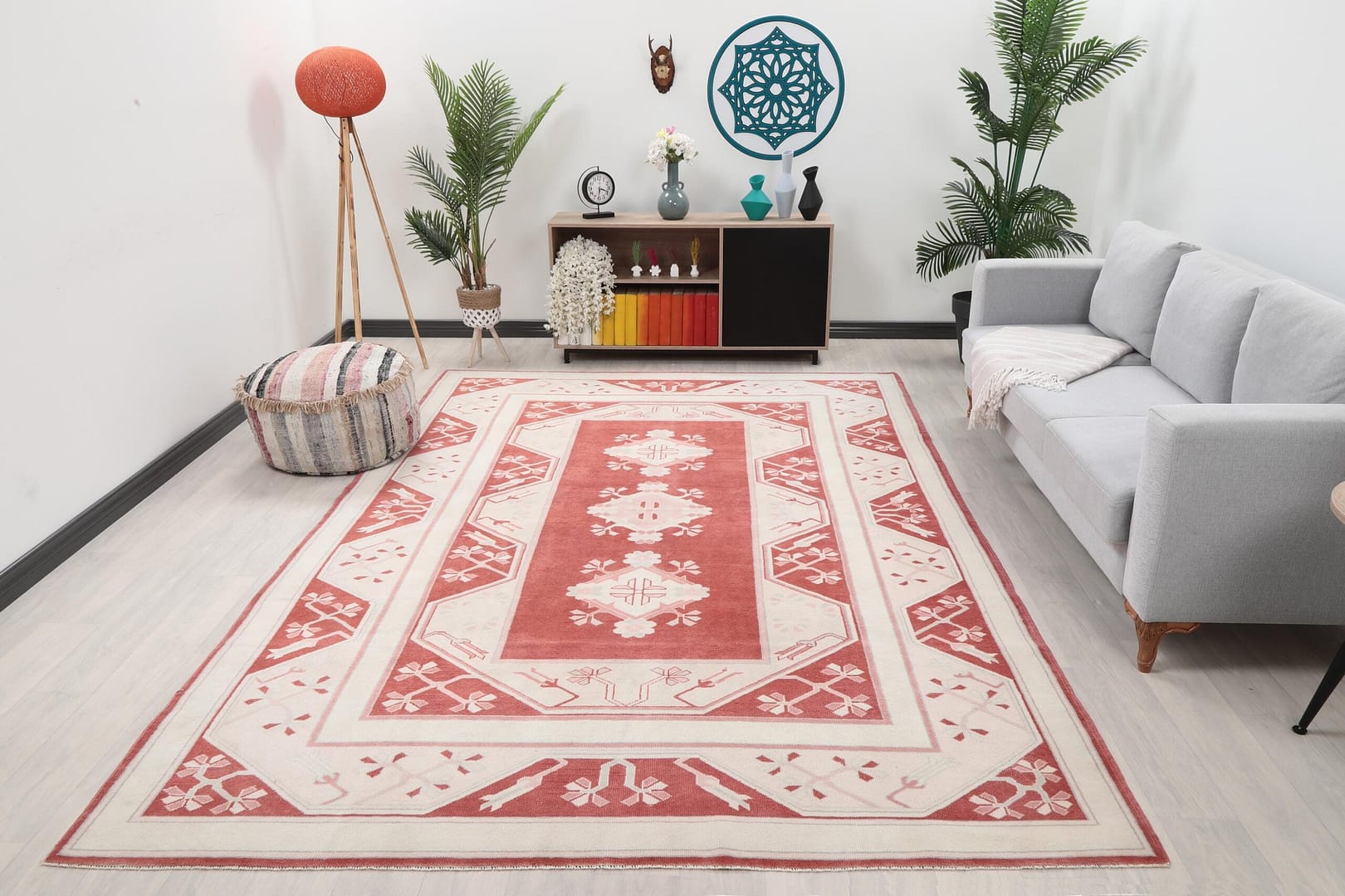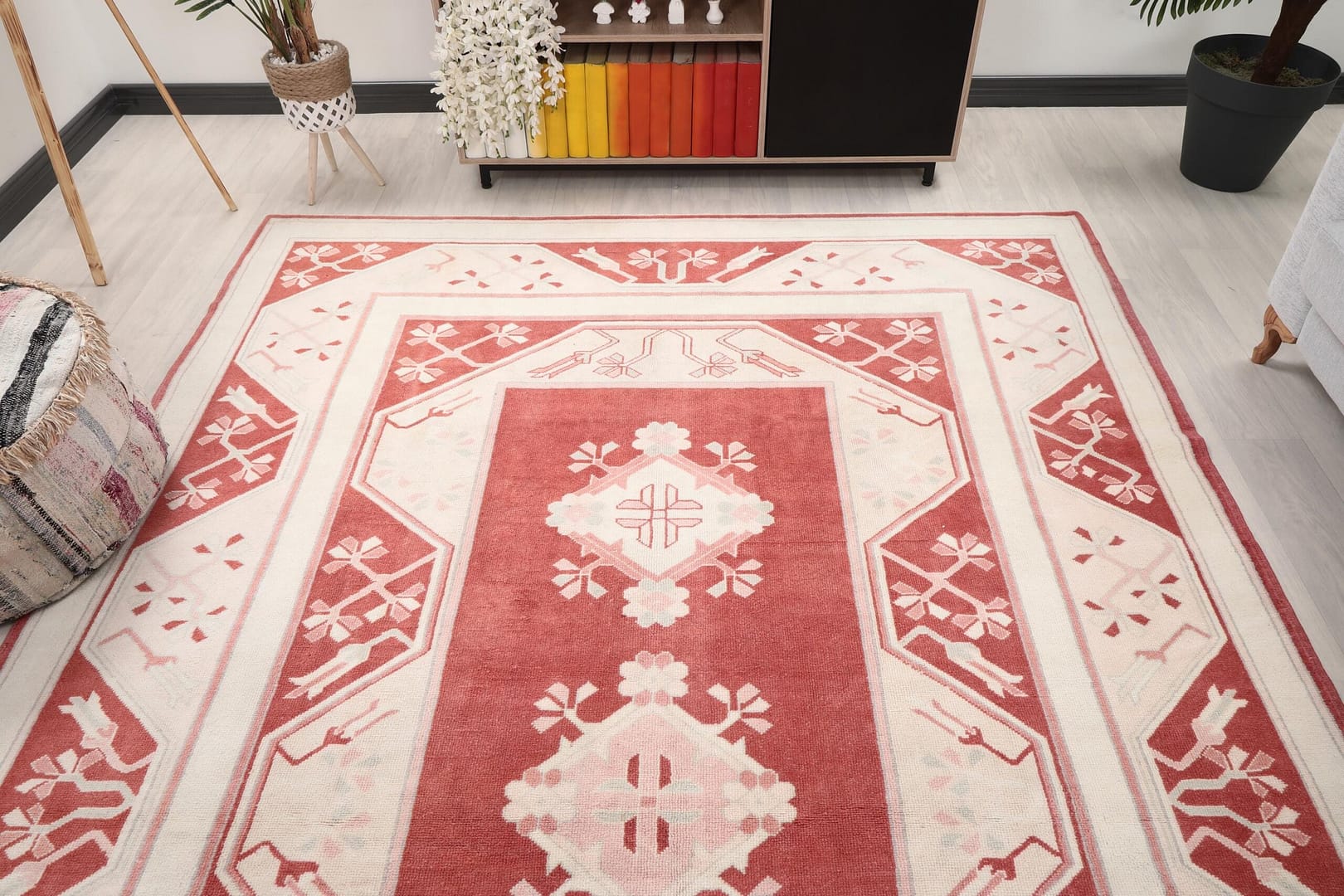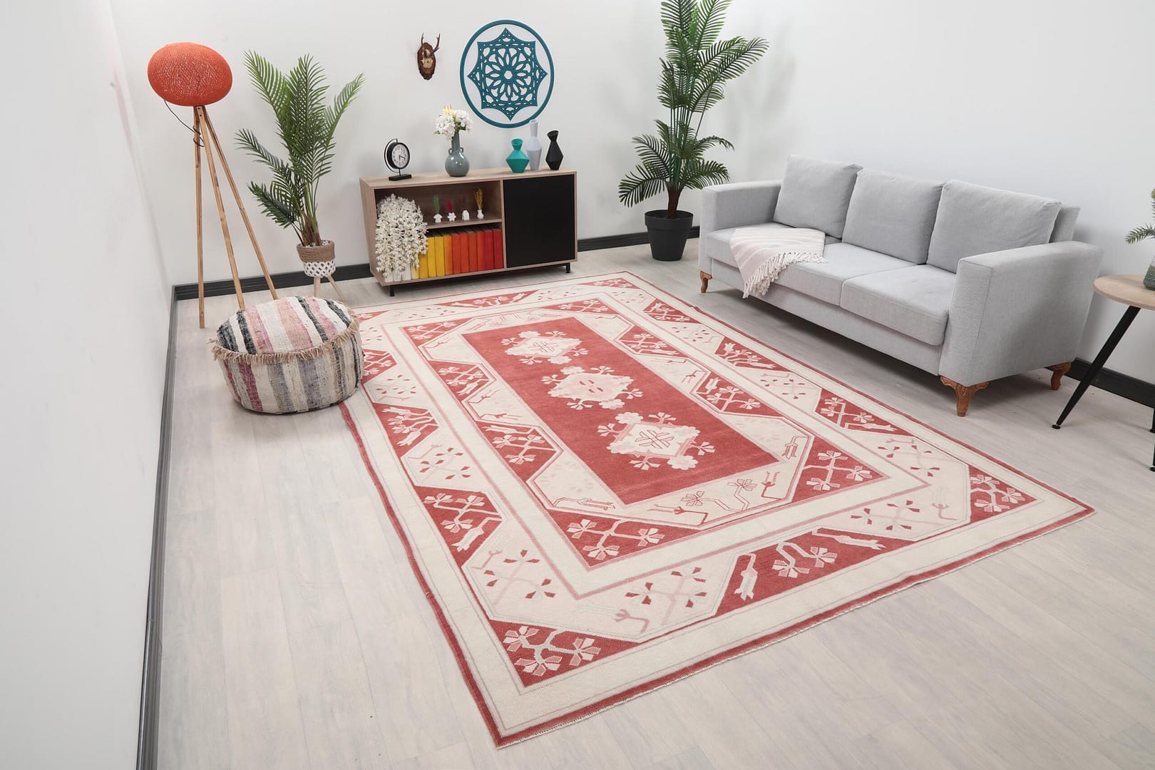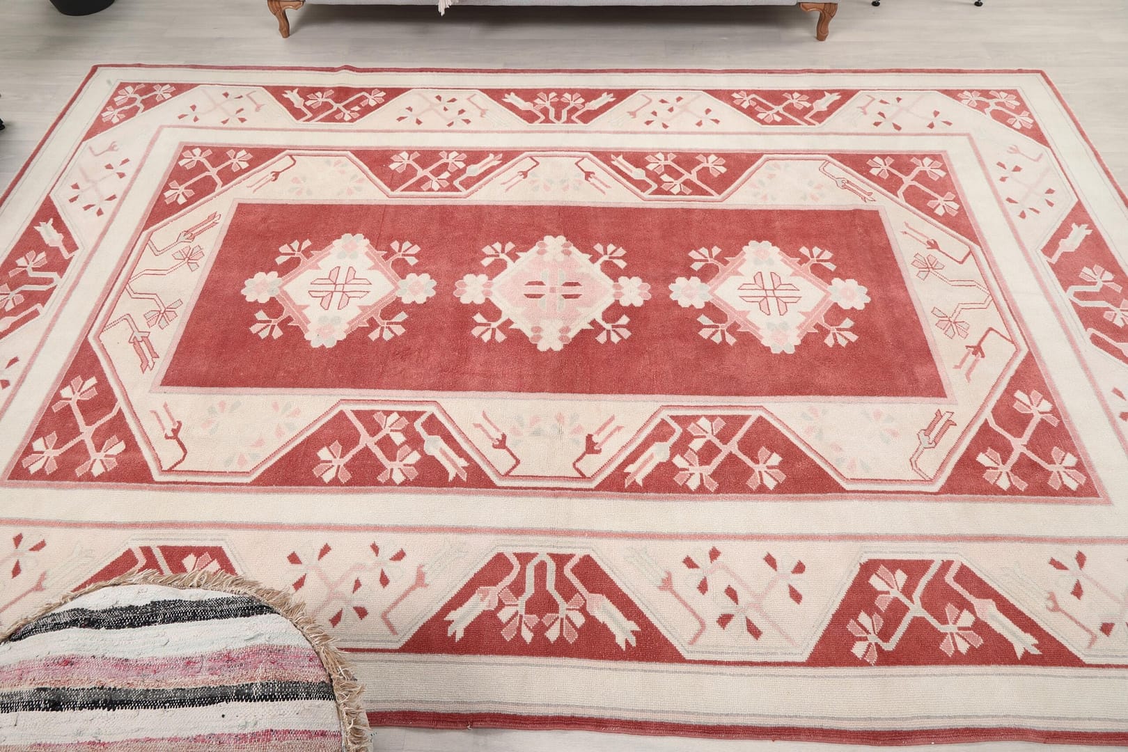7×12 Beige Red Turkish Rug, 7×12 Oversize Oushak Runner, Bohemian Patterned Runner, Handmade Wool Rug, Bedroom Area Rug, Living Room Rug