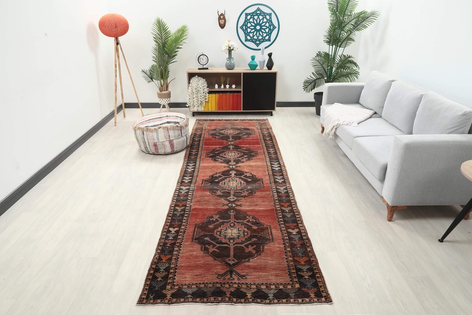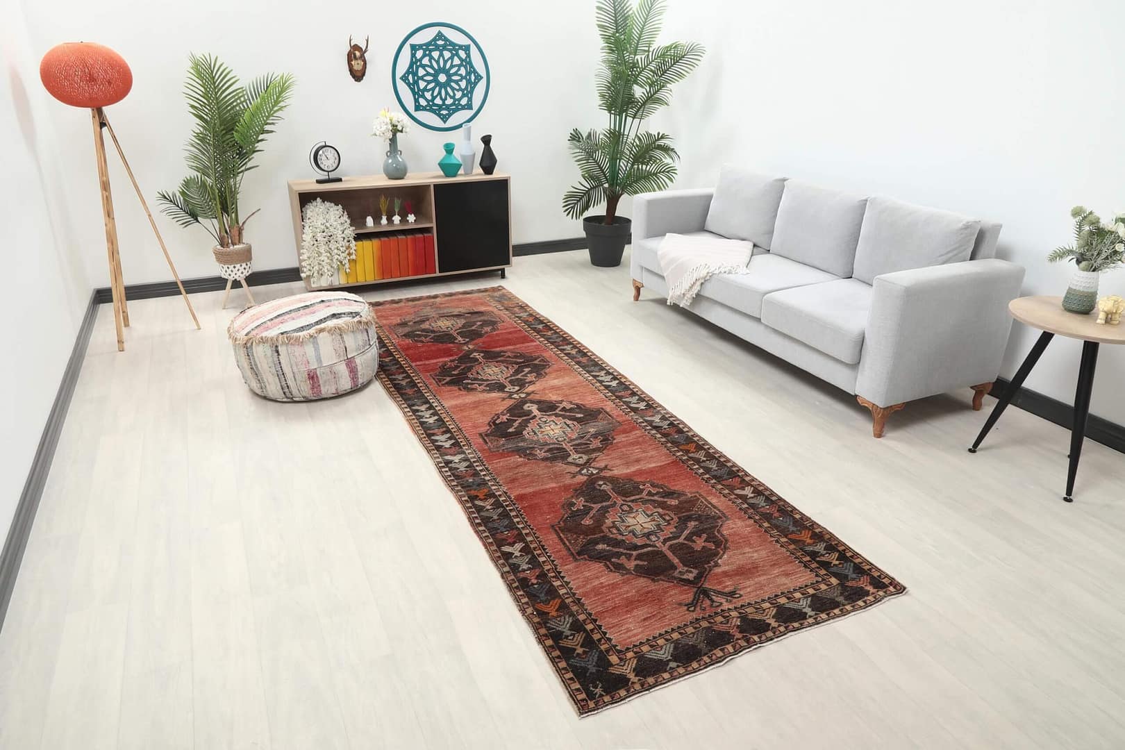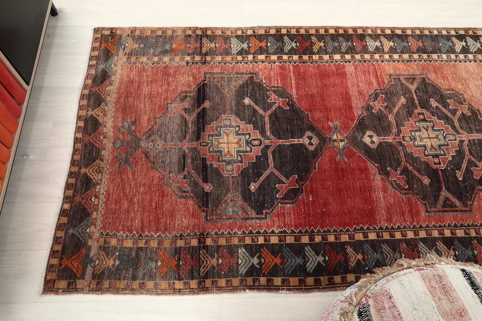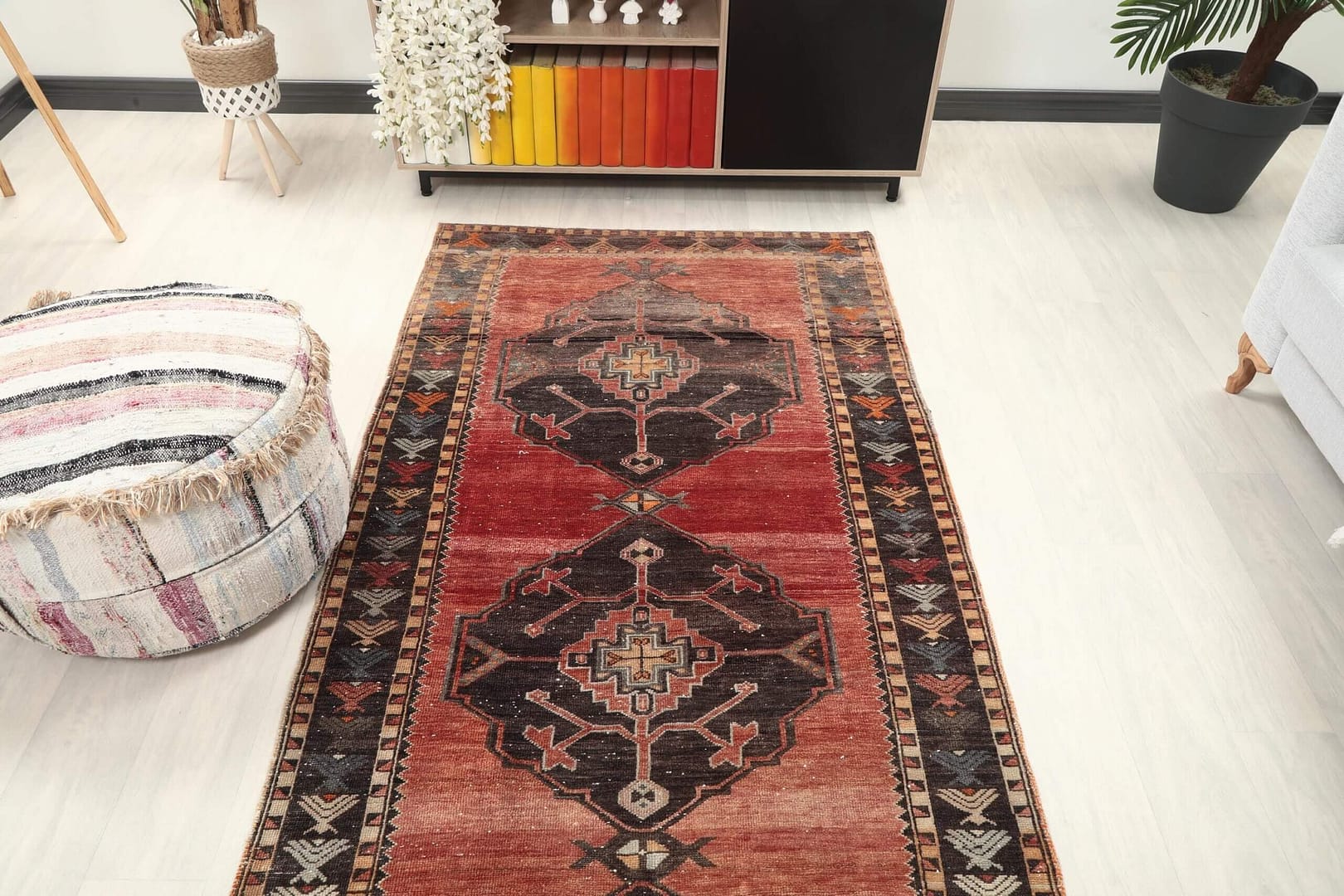 4×11 Red Brown Geometric Turkish Runner Rug,4×11 Handmade Rug, Oushak Runner, Bohemian Runner, , Vintage Rug, Kitchen Runner, Persian Runner
